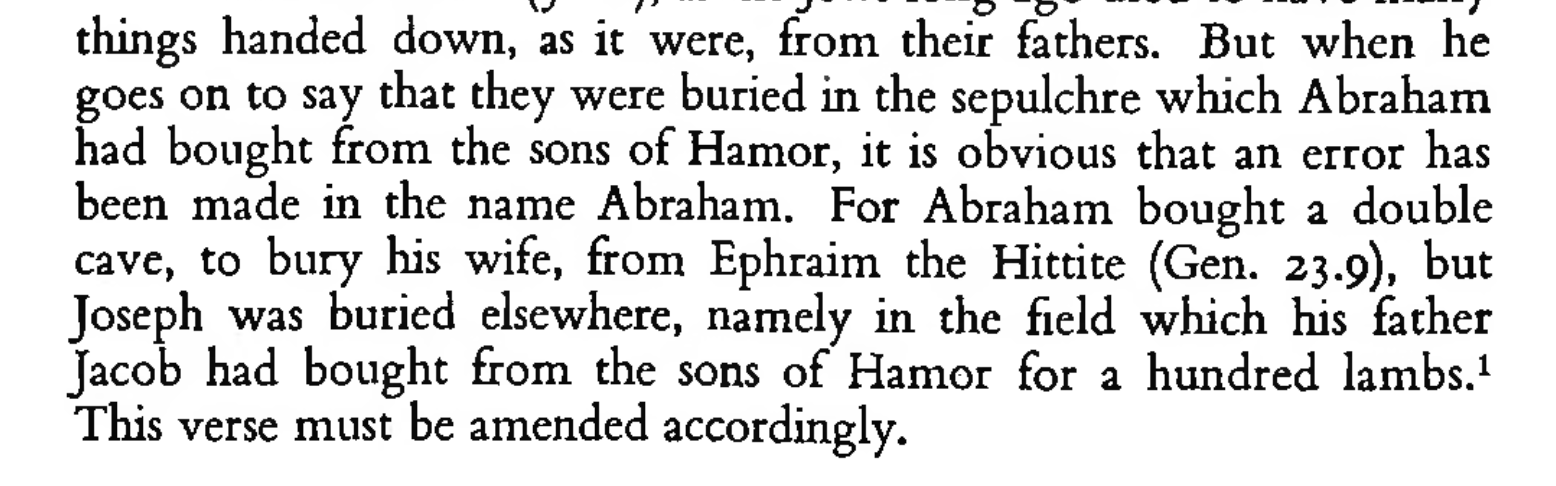 But when he goes on to say that they were buried in the sepulchre which Abraham had bought from the sons of Hamor, it is obvious that an error has been made in the name Abraham. For Abraham bought a double cave, to bury his wife, from Ephraim the Hittite (Gen. 23.9), but Joseph was buried elsewhere, namely in the field which his father Jacob had bought from the sons of Hamor for a hundred lambs. This verse must be amended accordingly.It looks like Calvin resorts to conjecture as a way to avoid a possible contradiction in the text [[again, Bruce provides a way of interpreting the text that does not necessarily result in a contradiction or error]]. Which sows more seeds of doubt though: the possibility that Stephen made an error in what he reported (another option that maintains inerrancy of the Scriptures might be Luke inerrantly recording Stephen’s errant words. FYI I am not an Acts scholar, and I’m not making a case for any particular interpretations here) or suggesting that the original text is lost to corruption? I think the thing Calvin and I would agree on is that the original text, whatever it is (and we could disagree with the ‘whatever it is’), does not have a mistake here.