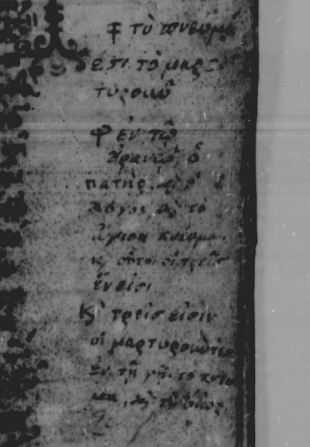 I can’t make out all the words, but I’m seeing το πν(ευμ)α το αγιο(ν) και ο π(ατ)ηρ (και)...the rest is more difficult. αιματος? It’s probably an obvious solution, and I’m happy to update the post if someone has a better image or can make more sense of it. There are a number of notes like this in the margins of 635, and there isn’t room for the whole CJ here anyway, so I didn’t want to spend too much time on it.